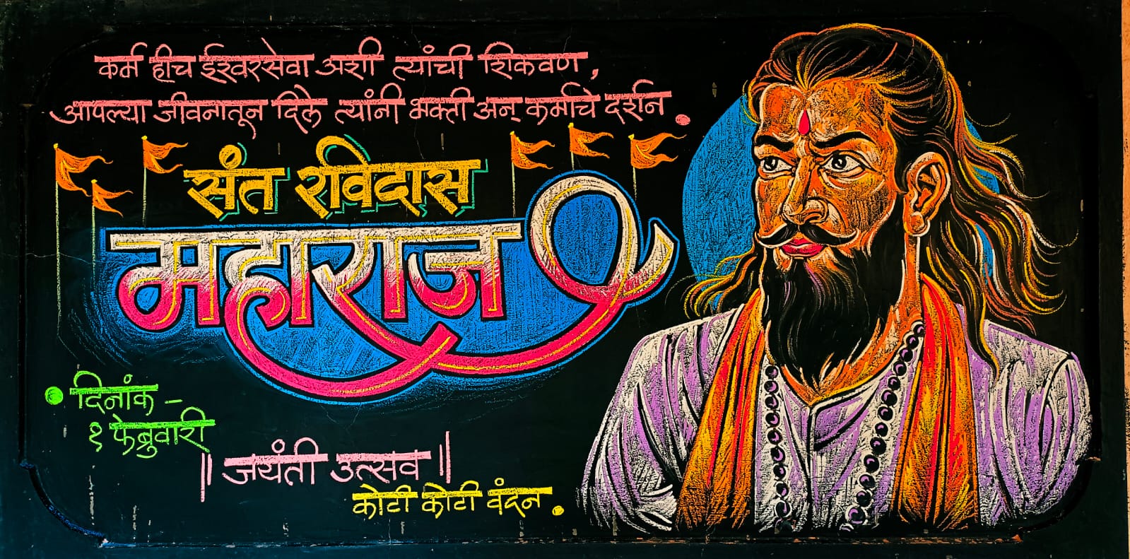 आज दिनांक – 1 फेब्रुवारी संत शिरोमणी रविदास महाराज यांच्या जयंती निमित्ताने से.फ.ला.हायस्कूल, धामणगाव- रेल्वे जिल्हा-अमरावतीचे कला शिक्षक -चित्रकार अजय जिरापुरे यांनी विदयालयाच्या दर्शनी फालकावर त्यांचे चित्र रेखाटन करून त्यांना विनम्र अभिवादन केले आहे .