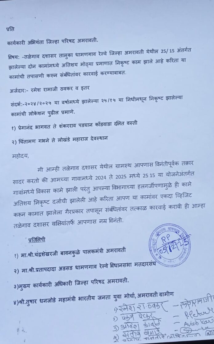 धामणगाव रेल्वे तालुक्यातील ग्राम तळेगाव दशासर येथे सुरू असलेल्या रस्त्याच्या कामाबाबत ग्रामस्थांमध्ये तीव्र नाराजी व्यक्त होत आहे. यापूर्वी गावकऱ्यांनी रस्त्याच्या निकृष्ट दर्जाच्या कामाविरोधात तक्रार करून उपोषण केले होते. त्या वेळी जिल्हा परिषद अमरावतीच्या बांधकाम विभागातील कार्यकारी अभियंता तसेच उपअभियंता यांनी ग्रामस्थांना आश्वासन देत रस्ता पुन्हा एकदा चांगल्या दर्जाने बांधून देण्याचे सांगितले होते.
