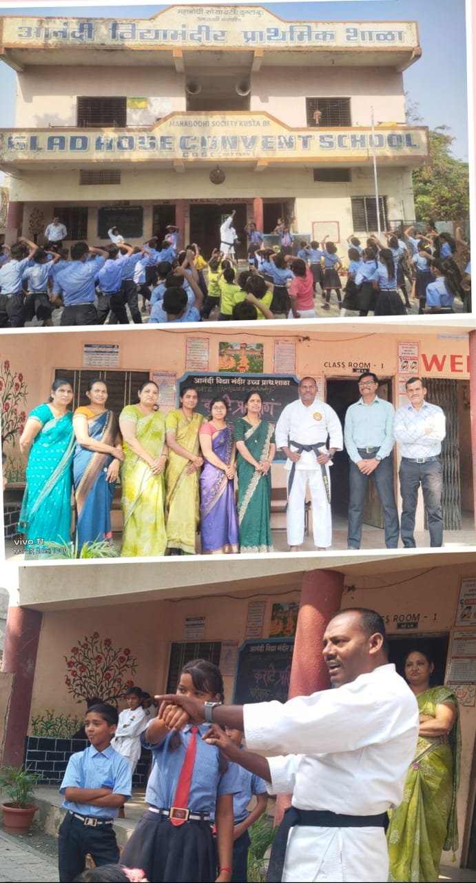 महाबोधी सोसायटी द्वारा संचालित आनंदी विद्या मंदिर उच्च प्राथमिक या शाळेमध्ये पहिल्यांदाच कराटे प्रशिक्षण घेत आहे अमरावती येते न्यू हनुमान नगर येथील आनंदी विद्या मंदिर उच्च प्राथमिक शाळा मध्ये पहिल्यांदाच मुला मुलींना आत्मसंरक्षणासाठी कराटे प्रशिक्षण देत आहे जिल्यातील कराटे सांस्कृतिक रुजून तरुणांमध्ये आत्मरक्षण व नवीन ऊर्जा निर्माण करण्यासाठी कराटे प्रशिक्षण आवश्यक आहे आजच्या घडामोडी मध्ये मुलीवर अत्याचाराचे प्रमाण वाढलेले आहे ते प्रमाण रोखण्यासाठी मुलींना स्वतःचं संरक्षण करणे गरजेचे आहे त्यासाठी त्यांना कराटेचे प्रशिक्षण देणे महत्त्वाचे आहे अशाच एका शाळेमध्ये आनंदी विद्या मंदिर शाळेमध्ये कराटे ट्रेनिंग देत आहे त्यामध्ये त्यांना स्वतःचं संरक्षण करणे व तलवारबाजी, नान चाकू लाठीकाठी अशा प्रकारे त्यांना प्रशिक्षण देत आहे या उपक्रमासाठी शाळेची मुख्याध्यपका शीतल नवले यांचे प्रोत्साहन आणि सहकार्य लाभलेले आहे व मुख्य कराटे प्रशिक्षक सचिन मून ब्लॅक बेल्ट 3rd दान व मास्टर प्रियांशी गवई, क्रिष्टी गवई तसेच शाळेची शिक्षिक विशाल गवई सह शिक्षक, रश्मी मुदगल सह शिक्षका , वंदना घोगरे सह शिक्षिका , नितेश धुरंधर सह शिक्षक , लीना थेटे सह शिक्षिका , वृषाली सावरकर सह शिक्षिका , सीमाताई टारपे शिपाई ,या सर्व शिक्षक शिक्षिका आणि कर्मचारी गण यांनी सहकार्य केले व या कराटे प्रशिक्षण ला सर्व विद्यार्थी व विद्यार्थिनी मोठ्या संख्येने उपस्थित होते..