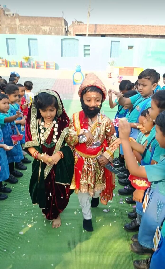 या कार्यक्रमामध्ये के जी २ चे विद्यार्थी ओजस मनोज पांडे शिवाजी महाराजांच्या वेशभूषेत आणि स्वरांगी आकाश येंडे जिजामातेच्या वेशभूषेत आले होते.