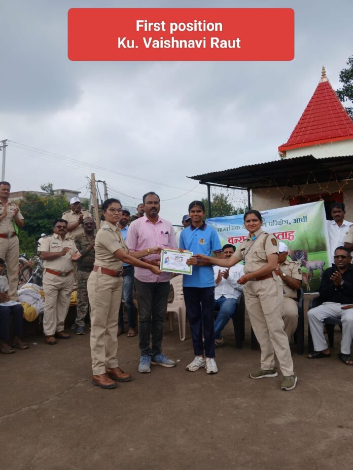 तसेच कु. रिया आशिष चव्हाण यांनी द्वितीय क्रमांक प्राप्त केला आणि खुशी नरेंद्र राव भिडे हिने तृतीय क्रमांक प्राप्त केला यांना वनविभाग आर्वी च्या अधिकाऱ्यांनी प्रत्येकी 501 ,301 आणि 201 रुपये रोख रक्कम तसेच प्रमाणपत्र देऊन त्यांचा गौरव करण्यात आला तसेच मुलांमधून रौनक अमोल इंगोले हा सहाव्या स्थानी आला या सर्व विद्यार्थ्यांचे मार्गदर्शन इको क्लबचे श्री नावेद गनी सर प्राचार्य श्री विश्वेश्वर पायले पर्यवेक्षिका कु. ज्योती अजमिरे सर्व शिक्षक शिक्षकेतर कर्मचारी यांनी अभिनंदन केले