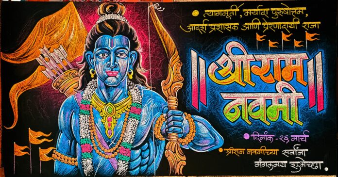 आज दिनांक – 26 मार्च श्री “रामनवमी” निमित्ताने धामणगाव एज्युकेशन सोसायटी द्वारा संचालित से.फ.ला.हायस्कूल, धामणगाव- रेल्वे जिल्हा-अमरावतीचे कला शिक्षक – चित्रकार अजय जिरापुरे यांनी विद्यालयाच्या दर्शनी फलकावर रेखाटन करून सर्वांना शुभेच्छा दिल्या आहे.