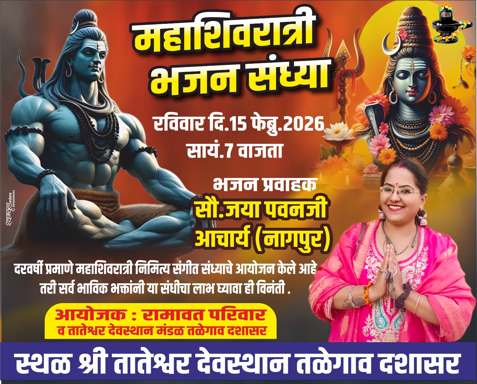 तलेगांव दशासर।।यहाँ के रामावत परिवार द्वारा निरंतर पिछले कई सालों से यहाँ के तातेश्वर मंदिर परिसर में महाशिवरात्रि पर्व के पावन बेला पर महाशिवरात्रि भजन संध्या का आयोजन किया जा रहा है।यहाँ यह कार्यक्रम अबकी बार 15 फरवरी को किया जा रहा है जिसे सौ.जया पवनजी आचार्य नागपुर अपने सुमधुर भजनों से सभी को भक्ति रस में लीन करेंगी।इस भजन संध्या का आयोजन आयोजक रामावत परिवार की ओर से श्री तातेश्वर मंदिर परिसर में 7 बजे किया जा रहा है भक्तों से आयोजक रामावत परिवार की ओर ने निवेदन है कि ज़्यादा से ज़्यादा संख्या मे इस भजन संध्या के भक्ति रस का आनंद लेवे व अपनी उपस्तिथि दर्शाकर कार्यक्रम कि शोभा बढ़ाये।