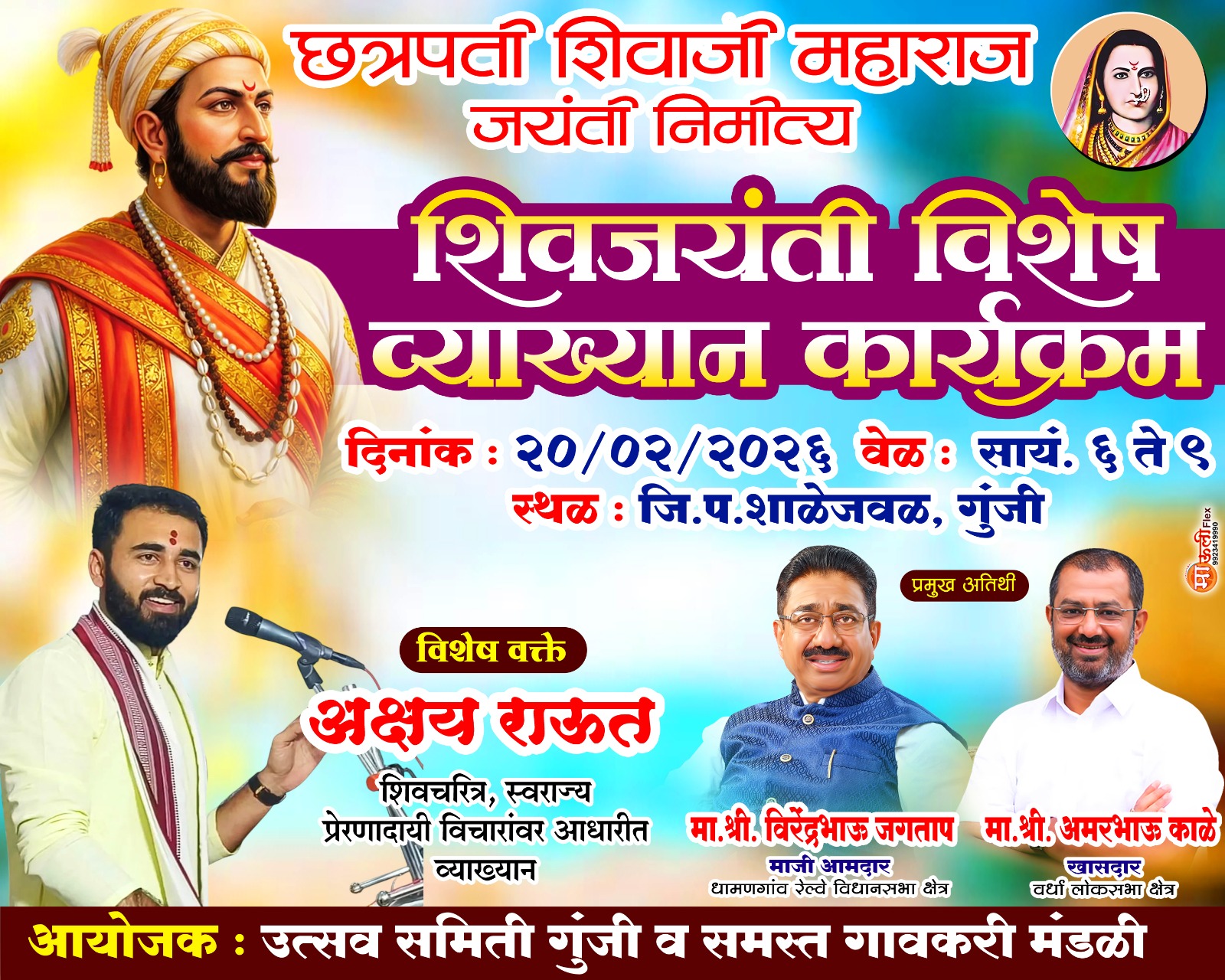 गुंजी :- छत्रपती शिवाजी महाराज जयंतीनिमित्त गुंजी येथे शिवजयंती विशेष व्याख्यान कार्यक्रमाचे आयोजन करण्यात आले आहे. हा कार्यक्रम दि. 20 फेब्रुवारी 2026 रोजी सायंकाळी 6 ते 9 या वेळेत जि.प. शाळेजवळ, गुंजी येथे आयोजित करण्यात आला आहे.