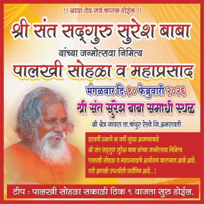 चांदूर रेल्वे : तालुक्यातील जावरा (ता. चांदूर रेल्वे) येथे श्री संत सद्गुरू सुरेश बाबा यांच्या जन्मोत्सवानिमित्त आयोजित पालखी सोहळा व महाप्रसाद कार्यक्रम आज भक्तिमय वातावरणात मोठ्या उत्साहात संपन्न झाला.